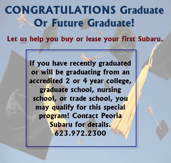 So if you have recently graduated or will be graduating from an accredited 2 or 4 year college, graduate school, nursing school or trade school, you may qualify for this special program! Contact Peoria Subaru today to find out!